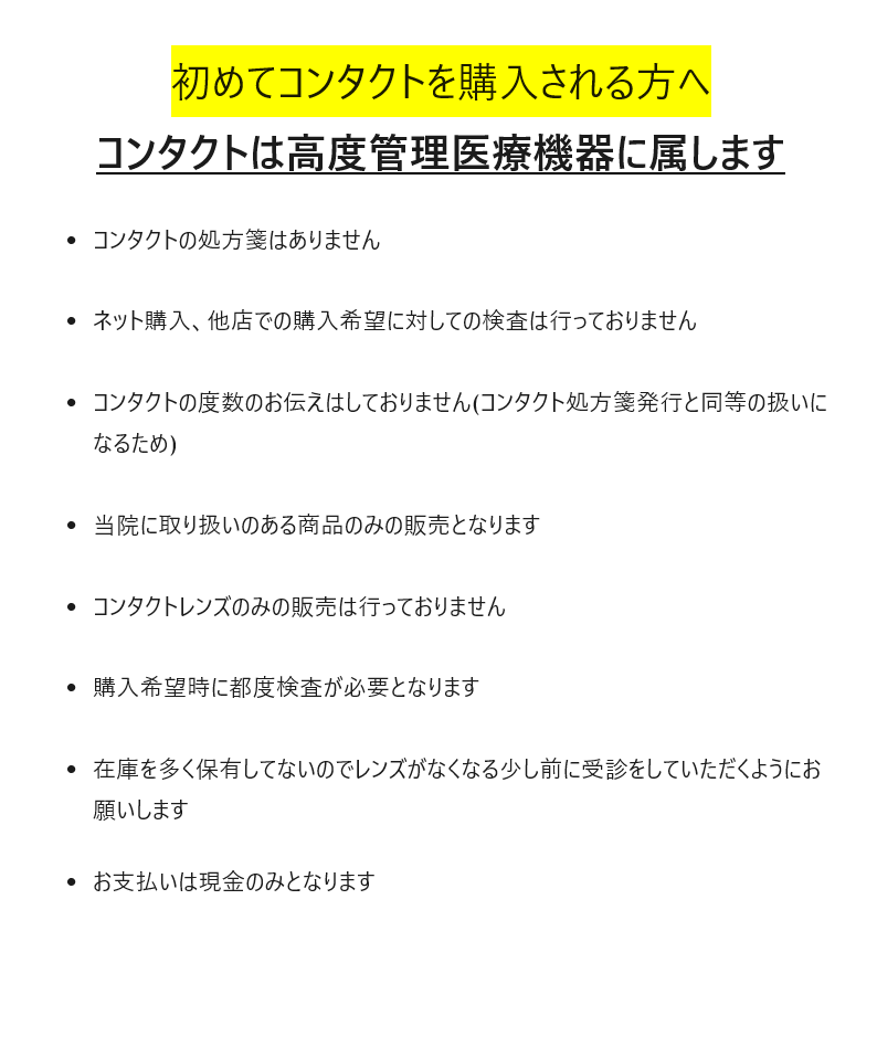 ※ 初めてのメガネやコンタクトレンズを作られる方は、午前は11:00まで、午後は16:30までにご来院ください