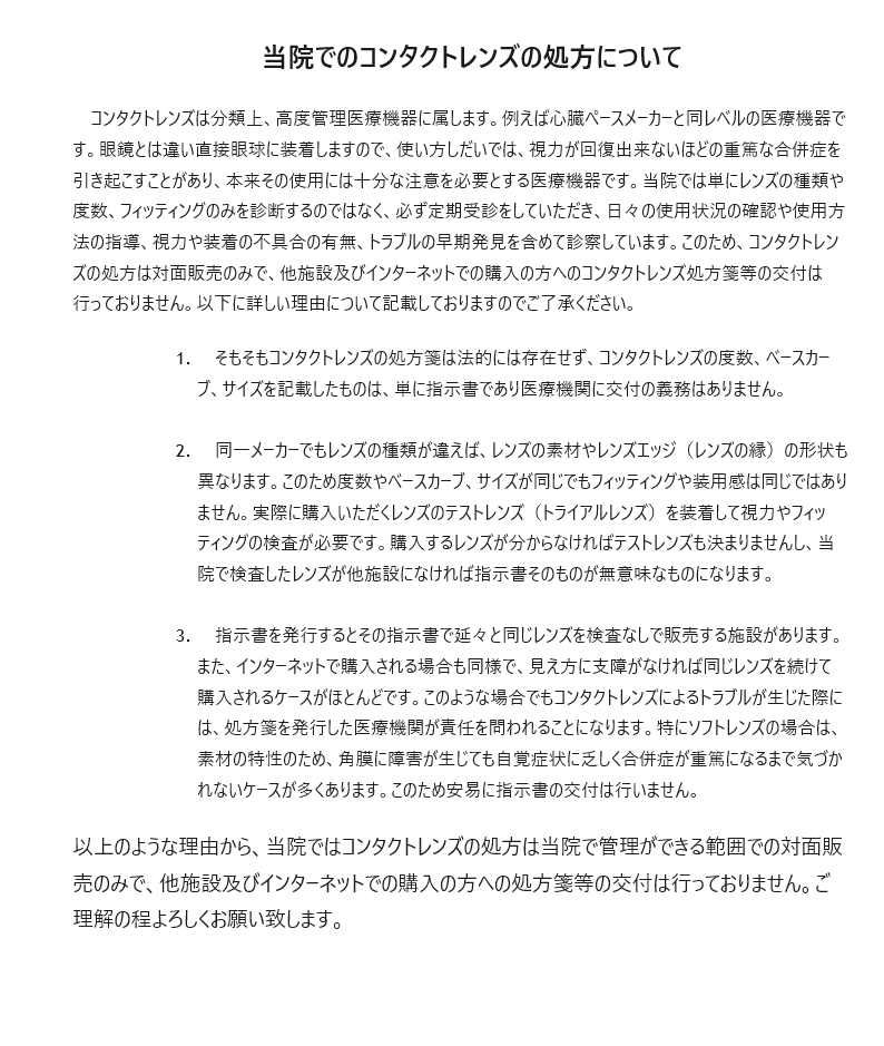 当院はコンタクトの処方箋はございません、また、コンタクトのみの処方もしておりません。